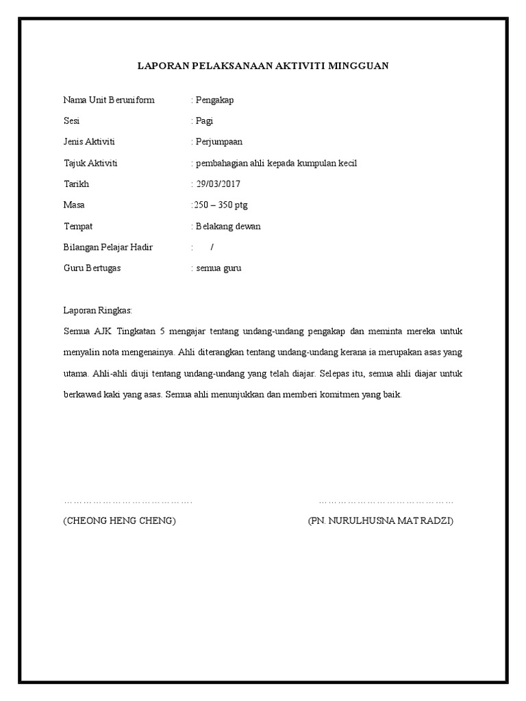 Secara keseluruhannya aktiviti perkhemahan ini berjalan dengan lancar Laporan disediakan oleh Nik Ahmad Uzair NIK AHMAD UZAIR BIN NIK AHMAD FAISAL Setiausaha unit pengakap. _____ laporan perjumpaan mingguan kokurikulum 2013 nama gerakerja kelab bola tampar lelaki perjumpaan kali ke 1 hari tarikh rabu 09012013 masa 400 500 petang tempat bilik sains sk pulau aman kehadiran ahli 88 enmuhamad zafir khalis bin alwi guru penasihat enmohd. Saya telah menyediakan satu borang Laporan aktiviti yang ringkas serta mudah diisi oleh guru bertugas atau guru penasihat Badan Beruniform Pengakap sejak tahun 2012.